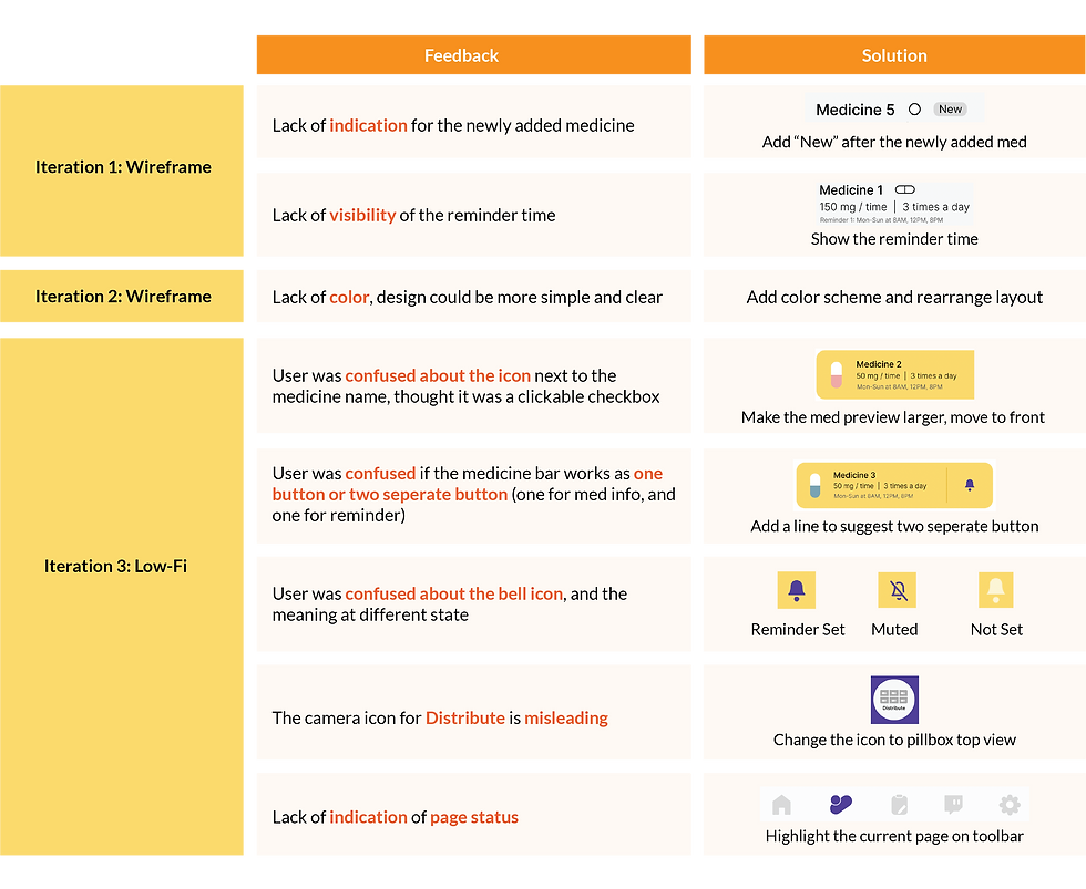 Throughout the process, we conducted one round of Heuristic Evaluation and two rounds of Usability Testing. The participants in the usability testing were potential users who fit the primary and secondary personas of caregivers and patients. The feedback focused on the Home Page, Medicine List Page, and Medicine Info Page.